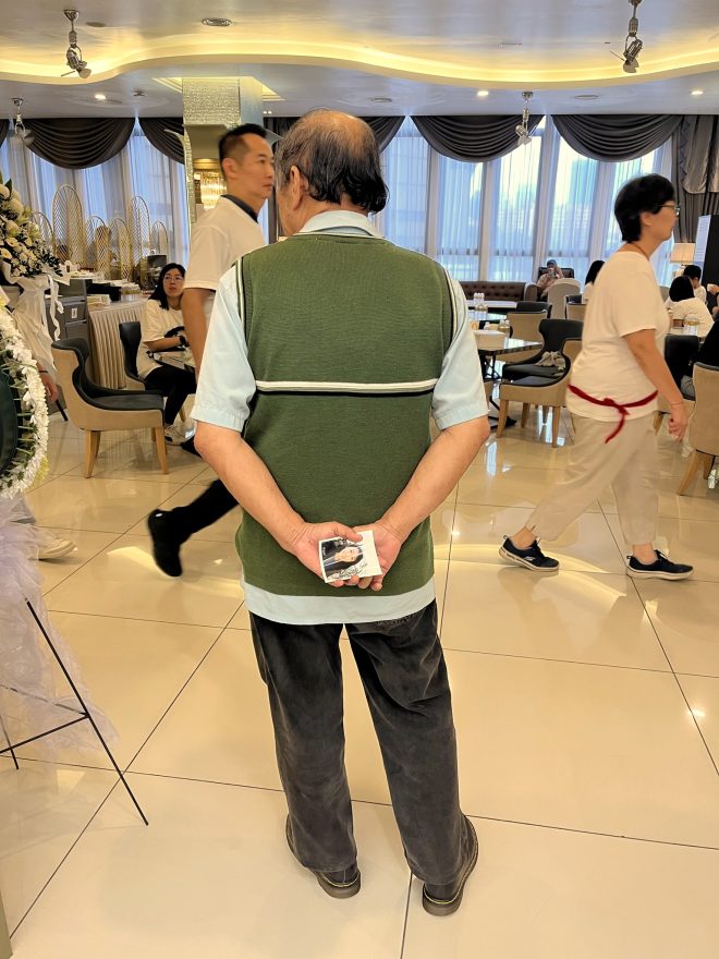 父親看起來為人嚴肅,雙手總是像紀律主任那樣握拳放在後腰,然後緩緩地在靈堂周圍走動,時不時會停留在靈堂前抬頭望著女兒的照片,偶爾會過來看看女兒的追思角落。